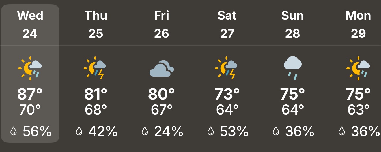 I am continuing to keep an eye on the forecast for Family Weekend this weekend. My best advice is to be prepared in case it rains, and hope we will be pleasantly surprised if the forecast improves. Here is what my Weather Channel app is showing as of this morning: