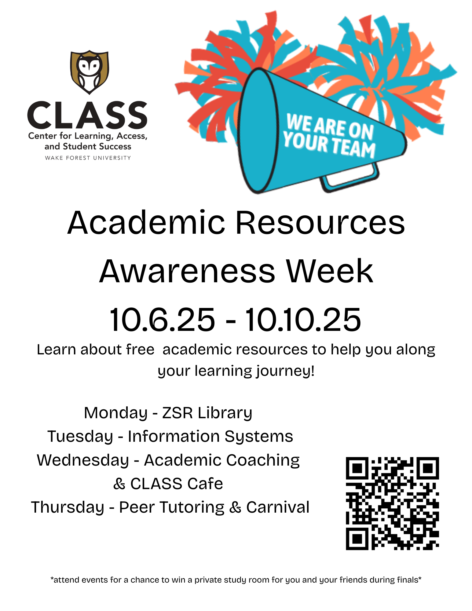 Academic Resources Awareness Week (ARAW) is an annual event every fall semester. The goal of ARAW, a signature CLASS event, is to make students aware of all the free on-campus academic resources available to them and normalize their use. From peer tutoring and help centers to academic coaching, ZSR research sessions, and more, Wake Forest offers a multitude of academic resources to help students along their learning journey. Students are encouraged to check out some or all of the great events planned every year.