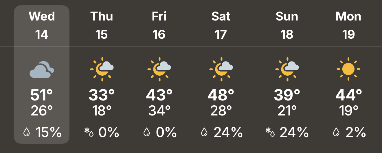 If your Deacs are not already in the habit of checking their weather app of choice before they leave their residence, now is a great time to start that practice. Winter in Winston-Salem can be a funny thing. Sometimes the temps are in the 60s or higher, sometimes in the 30s, and there can be a big temperature drop from one day to the next, so you can’t always use how yesterday felt when you plan to dress for tomorrow. To wit, see the 5-day forecast below. There is going to be a nearly 20 degree dip in the temps overnight.