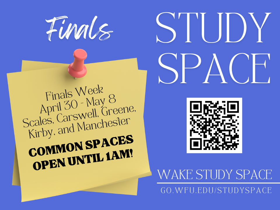 My friends who work on the academic side of the house are always cognizant of how finals week means we have a lot more students trying to use the library and other places to study. The College maintains this Wake Study Space website, which shows students both reservable space and common areas for study. They also extend building hours during finals week. Students can check out Wake Study Space to see more.